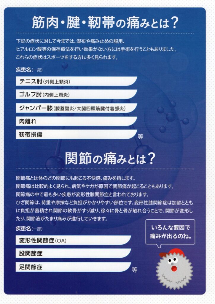 血小板には組織修復を促す成長因子が含まれており、その働きを利用して、損傷した組織の修復や痛みの軽減を促します。